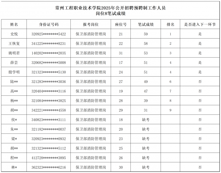 常州工程职业技术学院2025年预聘制工作人员公开招聘笔试成绩通知(岗位8)