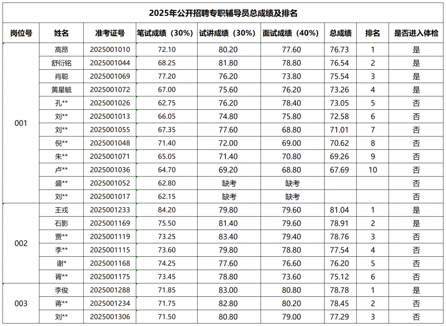 根据2025年10月20日发布的《常州工程职业技术学院2025年公开招聘专职辅导员和马克思主义学院教师 (第二批)公告》相关要求,我校组织考核,现将专职辅导员总成绩及进入体检人员名单通知如下: